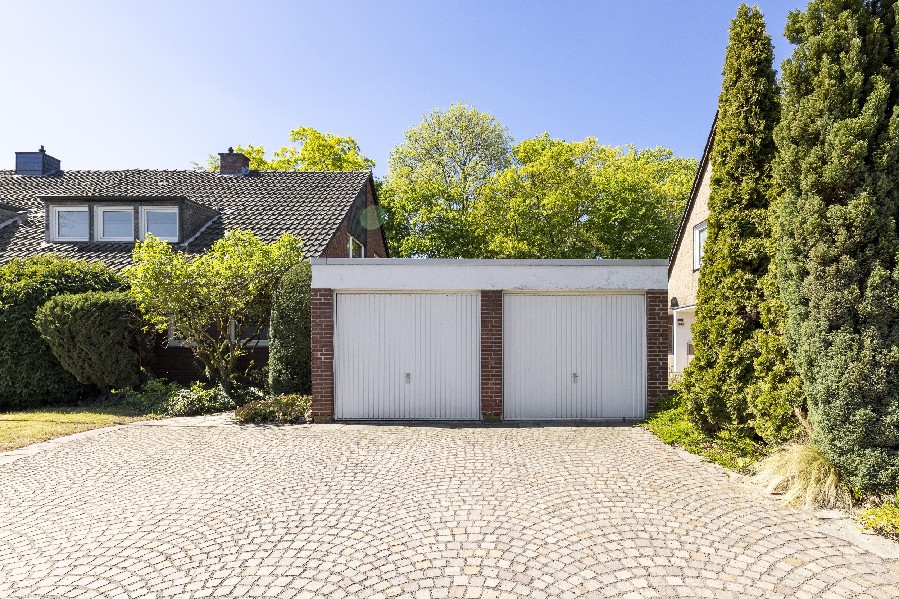 Besonders wertvoll ist die elektrisch zu öffnende Doppelgarage rechts neben dem Haus und die weiteren 2 PKW Stellplätze davor.